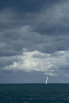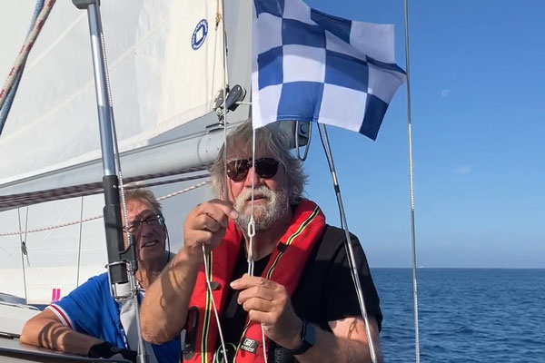 Am Samstagmorgen bläst nach der Hafenausfahrt ein optimaler Westwind. Mit Vollzeug rasen wir nach Süden. Nach einer Stunde dreht der Wind nach Norden. Der Versuch, mit Schmetterling und Bullenstander platt vor dem Wind zu segeln, scheitert. Die raue Welle ist zu hoch und der Wind mit 2-3 Beaufort zu schwach. Die Genua fällt ein und das Grosssegel knallt in die Leinen. Unter Motor reiten wir auf der 1 m hohen Welle.