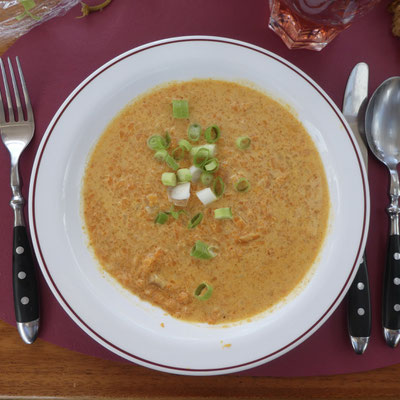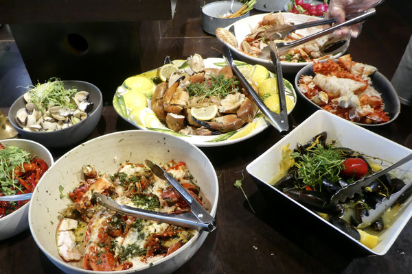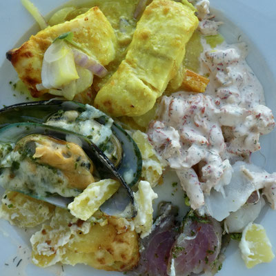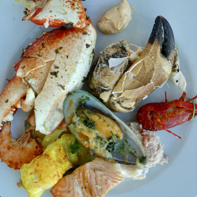 Spät am Abend geniessen wir ein reichhaltiges Buffet mit Avocado, kleinen Krebsen, Käse, Gurken-Mais-Salat, Schinken, frischem Brot und dazu einen feinen Rotwein.