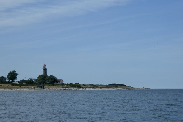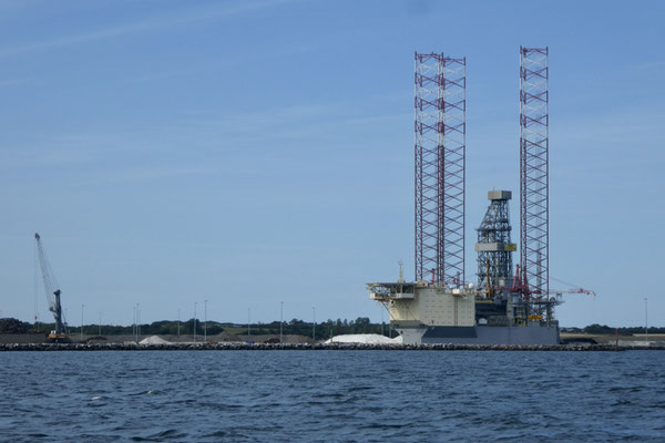 Der diesige Himmel hellt auf, und der blaue Himmel breitet sich mit viel Sonne aus. Der Wind legt etwas zu, doch auch der zweite Versuch mit den Segeln scheitert. Wir beschliessen, nach fünf Stunden Fahrt direkt bis Grenaa durchzufahren und Bonnerup rechts liegen zu lassen. Nach weiteren drei Stunden runden wir das Kap und steuern den Leuchtturm an, wo wir in ruhigeres Wasser eintreten. Die Welle flacht ab und vor uns taucht eine Ölbohrinsel auf. Schliesslich erreichen wir den Hafen von Grenaa, wo viel Platz ist – die Saison ist bereits seit einer Woche vorbei.