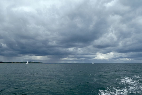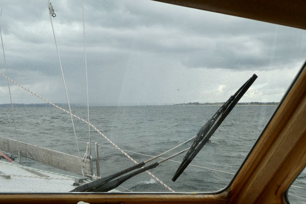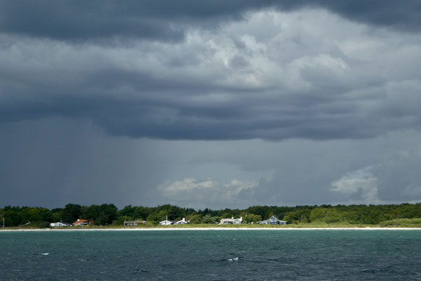 Beim Runden des Kaps Hasenøre erwischt uns eine Regenfront – es wird dunkel.