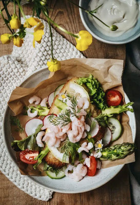 Mit knurrendem Magen machen wir uns auf die Suche nach einem guten Restaurant. Im Hotel Krone finden wir schattige Plätze und werden mit einer der berühmtesten Varianten des Smørrebrød verwöhnt – der Stjerneskud. Diese Delikatesse besteht aus klassischen nordischen Zutaten: Brot, Fisch, Remoulade, Garnelen, Salat, Spargel und vieles mehr. Es schmeckt herrlich nach Meer und Urlaub.