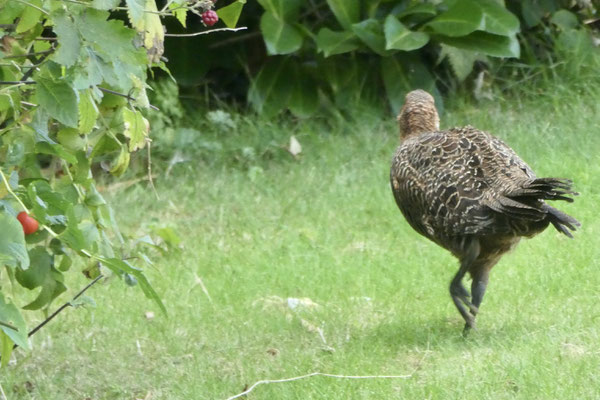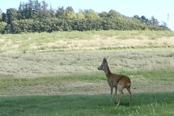Auf halbem Weg zurück treffen wir Vreni bei einer Erfrischung im Garten eines Wohnhauses. Der Rückweg zum Hafen wird durch Tierbeobachtungen unterbrochen. Ein Reh liegt nahe der Strasse im Gras. Etwas weiter rettet sich ein Fasan, später auch Fasanhühner,