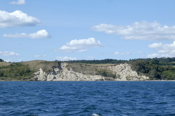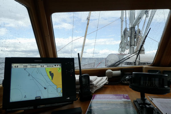Der Windfinder hatte uns gestern eine Welle von 20 cm prognostiziert, doch die tatsächliche Welle ist mindestens viermal so hoch. Auf DMI.DK, dem dänischen Wetterdienst, sind die Voraussagen wesentlich genauer. Poseidon neckt uns heute ein paar Mal. Nach optimalem Wind frischt es auf, wir reffen, dann dreht der Wind um 30 Grad, wir räumen zusammen und motoren weiter. Kurze Zeit später weht es wieder mit 3-4 Beaufort. Wir segeln weiter mit Genua und Besan. Dann wird es diesig, doch kurz darauf klart der Himmel auf und die Sonne scheint.