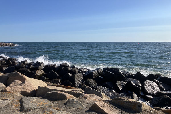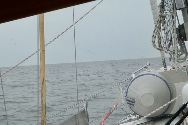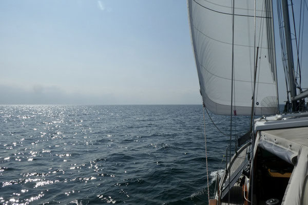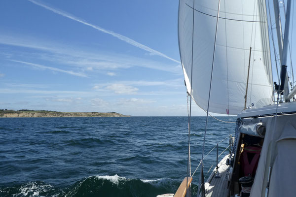 Am Freitagmorgen herrscht reger Verkehr auf der Mole. Die Autos fahren bis zum Aussichtspunkt und kehren dann zurück. Zeitig laufen wir aus und setzen gleich nach der Ausfahrt das Vollzeug. Die See hat sich beruhigt, die Ostwindwelle wird vom Westwind überlagert und flach gewalzt. Mit 3-4 Beaufort fliegen wir mit 6,5 Knoten durch das seichte Wasser.