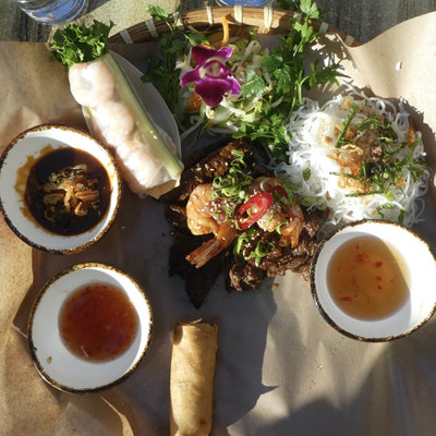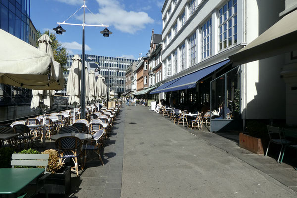 Wir schlendern durch die Fussgängerzone und besuchen verschiedene Geschäfte mit Haushaltswaren. Eigentlich brauchen wir nichts, aber bei einem kleinen vietnamesischen Restaurant lassen wir uns im Schatten verwöhnen.Im „Meny“ füllen wir unsere Rucksäcke mit Vorräten für die nächsten Tage. Die Auswahl an Frischwaren ist überwältigend. Schwer beladen radeln wir mit Rückenwind zurück zu Odin.
