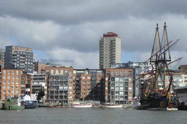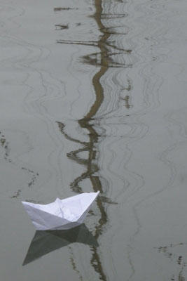 Zur Feier des Tages oder als Abschied lassen wir ein Papierschiff aus dem Hafen auf die Göta Älv zu Wasser. Es verschwindet bald hinter einem grossen Segelschiff.