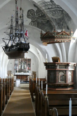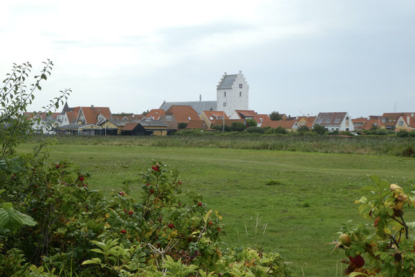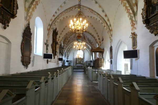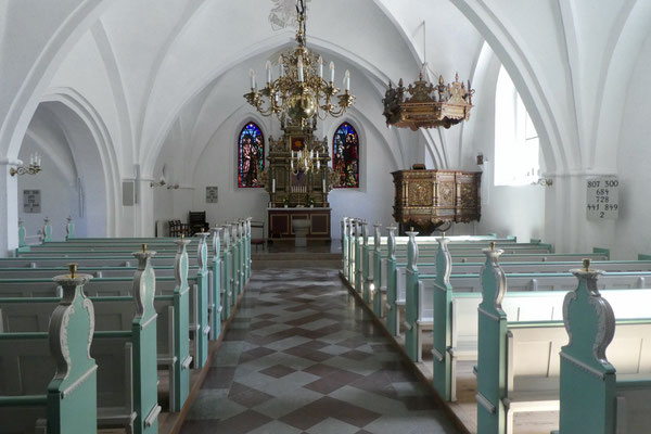 Am Dienstag, kurz vor dem Mittag, fahren wir mit den Mietfahrrädern ins Zentrum von Grenaa. Mit 4 BF Gegenwind kommen wir leicht ins Schwitzen. In der Fussgängerzone besichtigen wir die Kirche mit den auffallend hellblauen Bänken.