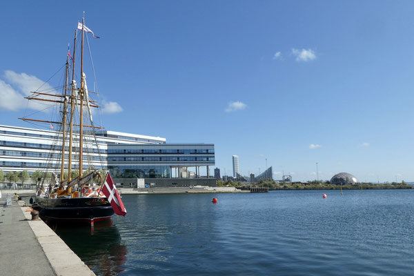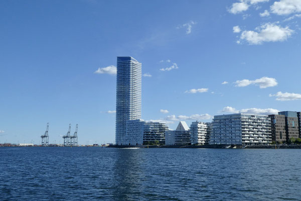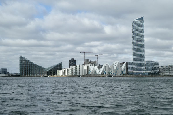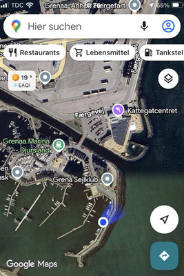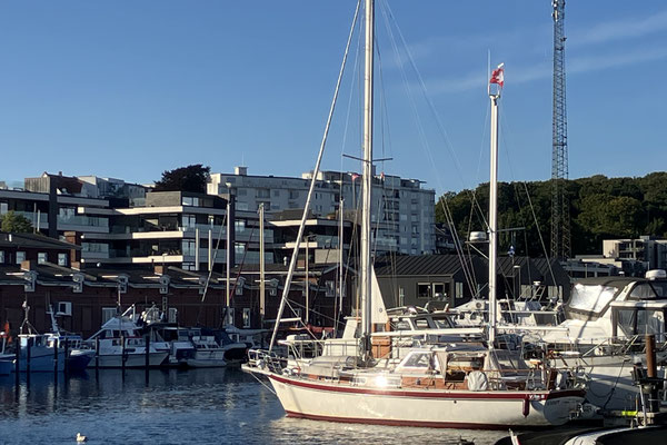 Die Fahrt wird nach vier Stunden unter Maschine fortgesetzt. Gegen 14:00 Uhr erreichen wir den Handelshafen von Ebeltoft. Die Gegend hat sich verändert: Statt der alten Siloanlagen stehen nun neue, schneeweisse Mehrfamilienhäuser am Hafen. Die Anlegestellen sind bis auf den letzten Platz belegt – wohl eine Folge der neuen Anwohner.