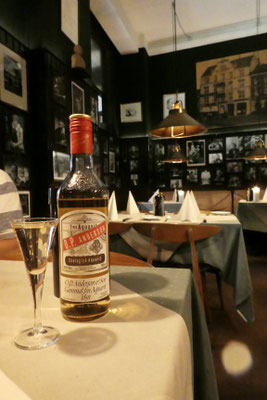 In einer Atmosphäre, die über die Jahre hinweg ihren Charme bewahrt hat, wird uns eine Variation von Heringen mit Beilagen serviert. Dazu bringt uns der Kellner eine Flasche Aquavit. Dieser wird aus einem Neutralalkohol mit etwa 96 Prozent Alkoholgehalt gewonnen, der auf Getreide und Kartoffeln basiert. Nach der Destillation wird er mit Kräutern wie Kümmel, Dill, Fenchel, Koriander, Zimt und Nelken verfeinert. Die anschliessende Reifung erfolgt in Holzfässern oder Edelstahltanks. Aquavit ist auch heute noch bekannt für seine verdauungsfördernde Wirkung, besonders nach einem reichhaltigen Mahl.