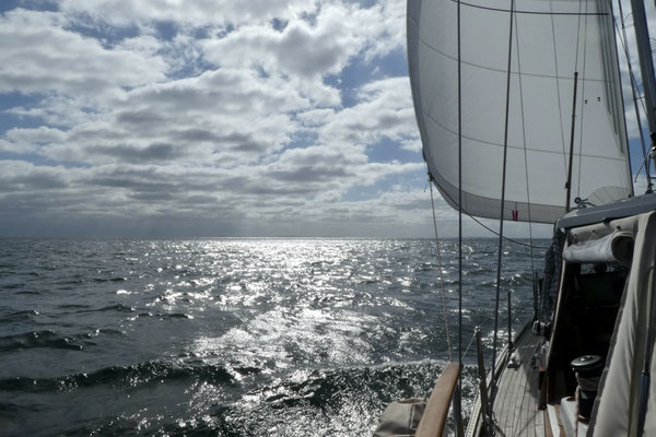 Am Donnerstag ist der Wind ideal zum Segeln nach Süden. Der ablandige Westwind mit 4-5 Beaufort erzeugt nur eine moderate Welle. Kurz nach der Hafenausfahrt setzen wir die Genua und den Besan. Die Krängung bei Böen ist so stark, dass das Bücherregal ausgeräumt werden muss.