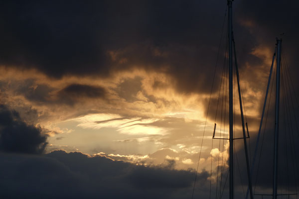 Am Mittwochmorgen ist der Wasserspiegel im Hafen um 70 cm gestiegen. Die ganze Nacht über hat der Wind geheult, die Masten gepfiffen, und die Leinen haben im Wind geknarrt.Besonders die Bug- und Heckleinen knarren bei jeder Bewegung. Nach dem Montieren der Gummidämpfer ist es wieder ruhig.