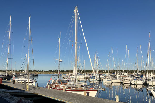 Wir kämpfen uns vier Stunden gegen die Welle quer ab nach Süden. In Hou schiebt uns die Grundwelle mit viel Wucht durch die enge Einfahrt. Das Echolot zeigt nur noch 10 cm unter dem Kiel. Wir landen längs an der Backbordseite der Quai-Mauer. In dem ruhigen, gepflegten Hafen setzen wir uns für das "Happy Landing" an den Tisch neben Odin.