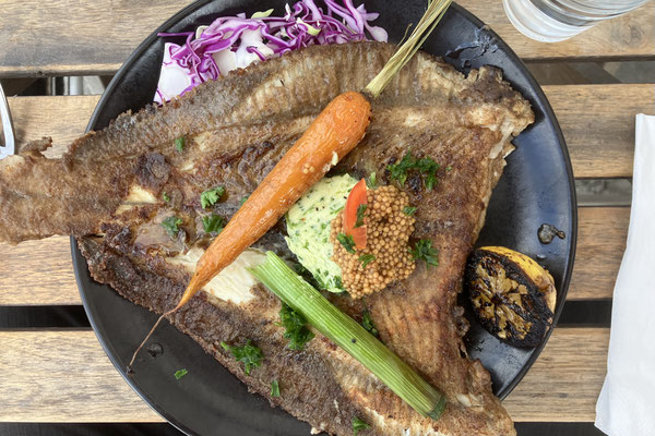 Voller Vorfreude machen wir uns auf den Weg zur Räucherei. Leider hat der Besitzer gewechselt, und es gibt keinen Rauchlachs mehr. Stattdessen geniessen wir eine Scholle mit Beilagen und lassen uns kulinarisch verwöhnen. Bis zum Einbruch der Dunkelheit spielen wir bei einem Glas Wein eine Runde Triomino.