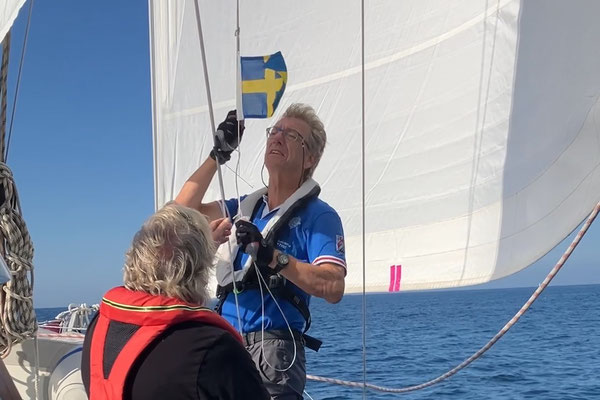 Zurück auf Odin wird das Deck und die Aufbauten gewaschen, um die Salzwasserrückstände zu entfernen. Danach setzen wir uns in die Sonne und plaudern mit der Mannschaft eines Schweizer Segelschiffs.