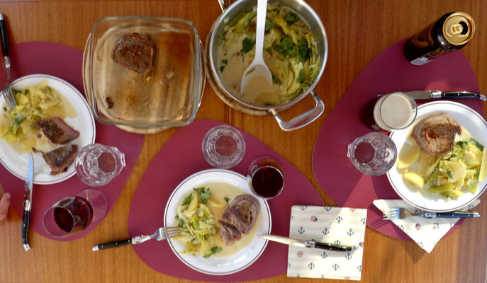 Ein kleiner Menühinweis: Als Belohnung für den harten Segeltag verwöhnt uns Vreni mit Tourendes, Lauch und Kartoffeln. Mmmmhh.