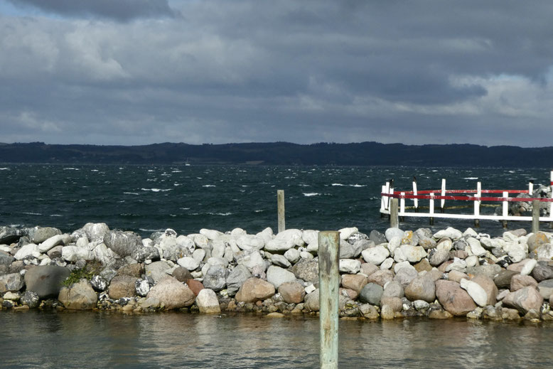 Am Freitagmorgen heulen die Wanten, und die Masten pfeifen wie Kirchenorgeln. Wir liegen hinter der Mole. Schäumende Wellen ziehen über die Bucht von Ebeltoft und schlagen mit 6-7 Beaufort auf die Steinschüttung. Odin wird an den Steg gerückt, die Fender sind fast platt. Wir hängen alle zehn auf der Steuerbordseite.