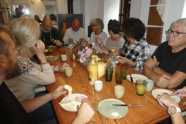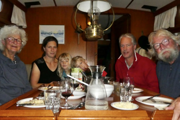 Zum Abendessen kocht Vreni für alle ein feines Risotto, für die Kinder gibt es Teigwaren. Nach dem langen Ausflug sind alle hungrig. Der Salon wird zur Belastungsprobe: Mit fünf Sitzplätzen auf den Polstern und einer umfunktionierten Bierkiste mit Sitzkissen finden schliesslich alle einen Platz.