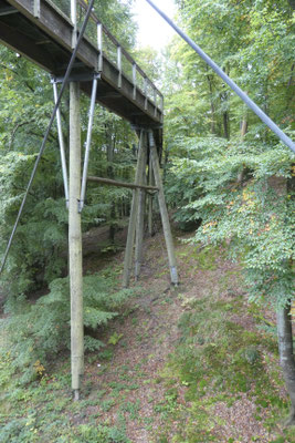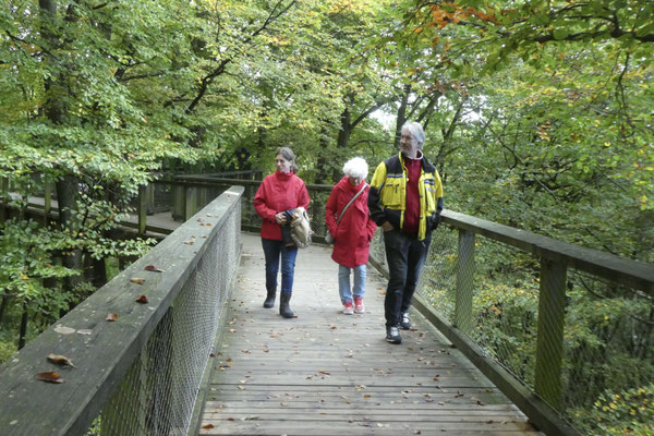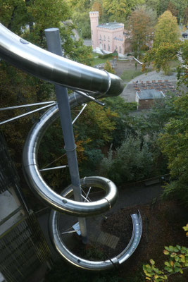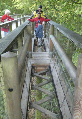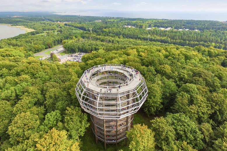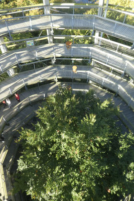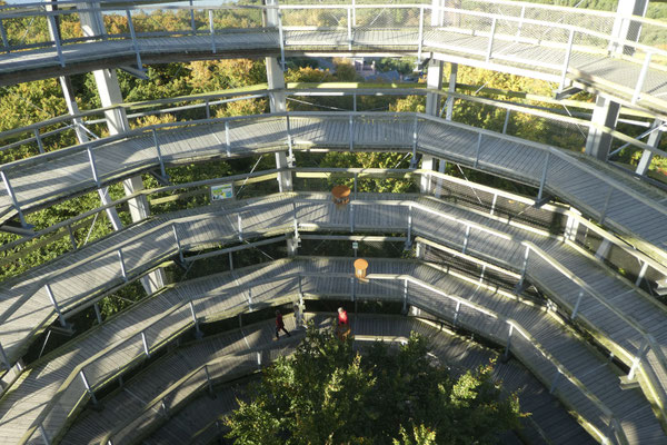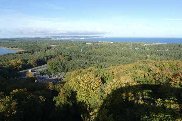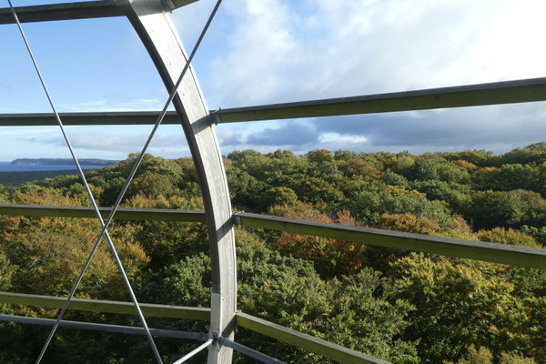 Der Pfad beginnt auf einer filigranen Holzkonstruktion. Mit leichter Steigung schlängelt sich der Weg stufenlos durch die Baumkronen des Prora-Waldes und schwebt dabei stellenweise bis zu 15 Meter über dem Waldboden. Am Fuss des "Adlerhorsts" erreichen wir bereits eine Höhe von 42 Metern. Milena und der Grossvater bewältigen als Erste die 12 Windungen bis zum 40 Meter höheren Adlernest im Aussichtsturm. Oben angekommen, werden wir mit strahlendem Sonnenschein, blauem Himmel und einem grandiosen Ausblick über ganz Rügen belohnt.