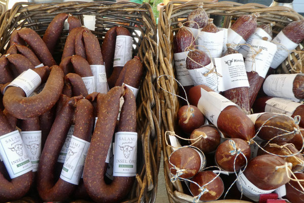 Mo und Paul verwöhnen uns mit einer Vielzahl an Wurstproben. Natürlich decken wir uns gleich mit einigen Salamis ein. Mit Quarkbällchen und Eis lassen wir den kulinarischen Ausflug für heute ausklingen. Der Rügenmarkt ist nur schwach besucht. Die Händler stehen träge herum und lauern auf potenzielle Kunden.