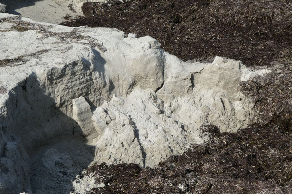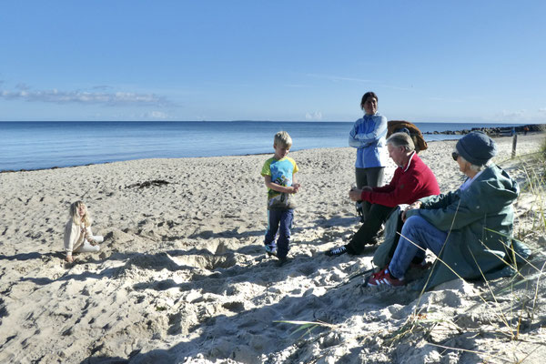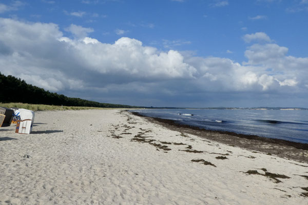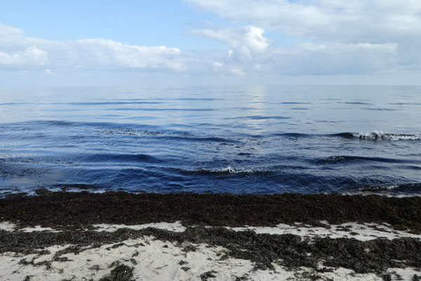 Kurz nach dem Anlegen machen wir uns auf den Weg zur Ostseeküste. Am Waldrand begrüsst uns ein Specht. Dann hören wir das vertraute Rauschen der kleinen Wellen am endlosen Sandstrand. Vom letzten Ostwind liegt noch viel Seegras am Ufer.