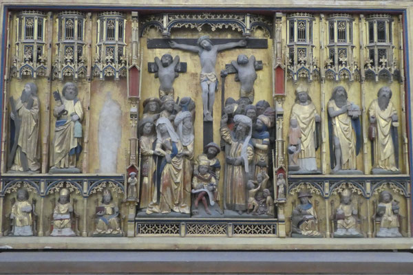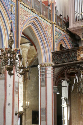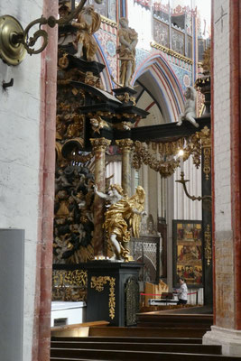 Der Bau der dreischiffigen Basilika begann um 1290 und wurde Mitte des 15. Jahrhunderts vollendet. Der Kirchturm ragt heute 86 Meter in den Himmel. Der wuchtige Baukörper wird geprägt durch das grosse Querhaus und den mächtigen Westbau. Staunend betreten wir das beeindruckende Gotteshaus. Die Ausstattung ist reich und bedeutend – besonders hervorzuheben sind der Hauptaltar, die Predigtkanzel, die Orgel, ein Bronzetaufbecken und die berühmte astronomische Uhr.