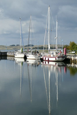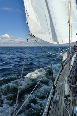 Bei Sonnenaufgang werfen wir am Montag die Leinen los und tuckern langsam zum Ziegelgraben. Pünktlich um 08:20 Uhr werden die beiden Brücken geöffnet – freie Fahrt durch den Strelasund. Beim Palmer Ort steht nur eine kleine Welle. Bei Windstärke 4 bis 5 segeln wir entlang der Tonnenstrasse Richtung Norden. Mit Genua und Besan geniessen wir einen rassigen Halbwindkurs und laufen kurz nach Mittag im Hafen der Vilm-Werft in Lauterbach ein.