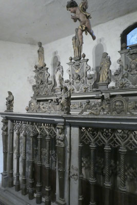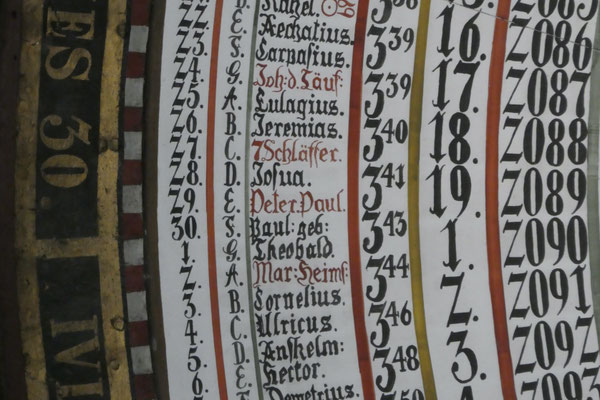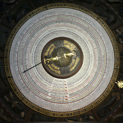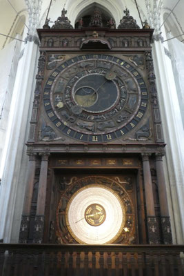 Im Chorumgang hinter dem Hochaltar füllt eine elf Meter hohe astronomische Uhranlage den gesamten Raum. Das Ziffernblatt misst über 16 Quadratmeter. Unterhalb der Hauptuhr befindet sich ein Kalendarium. Die Kalenderscheibe dreht sich im Uhrzeigersinn einmal im Jahr. Ein fest montierter Zeiger, gehalten von einer stilisierten Figur, zeigt auf die fünf äusseren Skalenringe, auf denen sich die Kalenderdaten ablesen lassen. Seit Januar 2018 ist die fünfte Scheibe in Betrieb – sie reicht bis ins Jahr 2150.