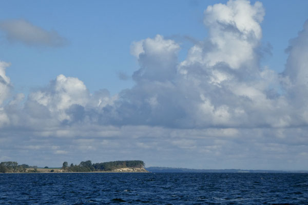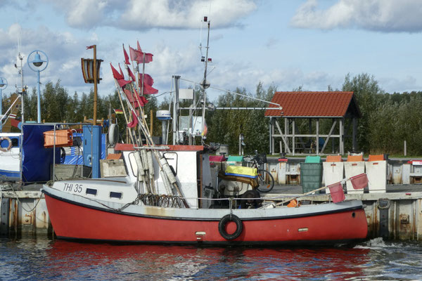Am Mittwochmorgen liegt die See spiegelglatt. Trotzdem brechen wir auf in den Greifswalder Bodden und durchpflügen mit unserer Bugwelle das ruhige Wasser. Vorbei am Grossen Zicker erreichen wir die schmale Tonnenstrasse nach Thiessow – 30 Minuten höchste Konzentration, mit teils weniger als einem Meter unter dem Kiel. Direkt neben der kaum zehn Meter breiten Zufahrt liegt das Wasser stellenweise nur 50 cm tief. Schwäne und Seevögel tummeln sich in den flachen Bereichen. Der kleine Hafen bietet nur wenige Gastliegeplätze. Drei Segelboote sind bereits ausgelaufen – genug Platz also für unseren Odin.