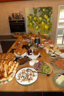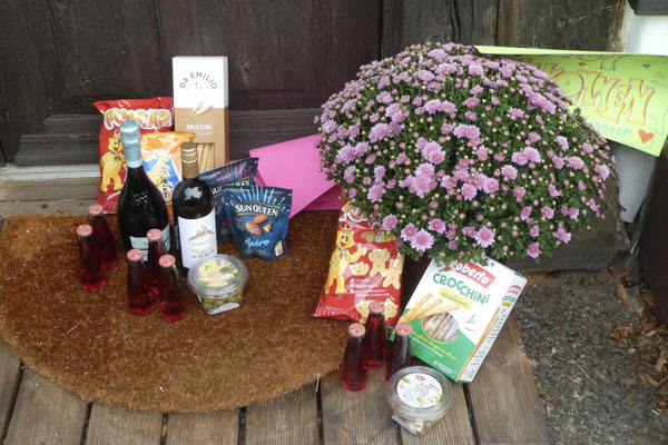 Der Eingang zu unserem Haus ist mit Begrüssungswünschen, Aperowein und Knabberzeug dekoriert. Wow! Nach dem Deponieren des Gepäcks wird die Heizung in Betrieb genommen. Danach müssen wir uns sofort auf den Weg machenss. Bei Muck hat sich die gesamte Lindhofbande mit Kind und Kegel versammelt und wartet bei einem Apéro-Rich auf unser Eintreffen. Eine herzliche Begrüssung folgt. Wir sind wieder zu Hause.
