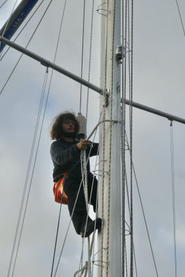 Mit dieser festen Überzeugung kommt Malte, der Elektriker von gestern, zurück an Bord. Nach Durchsicht der Unterlagen ist er sich sicher: Nicht der Radar selbst ist defekt, sondern irgendwo die Zuleitung. Morgen – nach dem Mastlegen – möchte er den Radar abbauen und umfassend testen. Das freut uns sehr! Über ein Jahr lang hatten wir verschiedene Fachleute konsultiert und immer wieder gehört, der Simrad-Radar sei ein schlechtes Produkt und nicht mehr reparabel. Malte hingegen ist anderer Meinung: „Simrad ist das Beste, was man kriegen kann!“