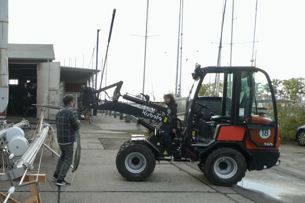 Am Donnerstagmorgen geht es um 06:00 Uhr los – Tagwache. Björn möchte heute die Masten ablegen. Um sieben Uhr starten wir. Nachdem die Topwante am Besan gelöst ist, kann der Bolzen der Genickwante ohne Drehung am Terminal gezogen werden. So bleibt die Einstellung für das Ausrichten der beiden Masten erhalten. Um neun Uhr liegen die Masten neben Odin auf den Böcken, bereit für die Lagerung in der Halle.