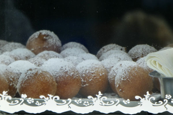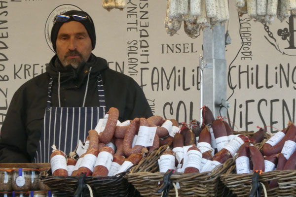 Auf der „Fressmeile“ entdecken wir Mo und Paul an ihrem Wurststand. Sie begrüssen uns herzlich – das letzte Mal haben wir sie vor sechs Jahren hier getroffen. Nach einer kleinen Vorspeise mit Quarkbällchen decken wir uns mit geräuchertem Rotbarsch und Buttermakrele ein. Im Fischladen finden wir dazu noch feine Fischbrötchen. Beim Essen klopft jemand Vreni auf die Schulter – es ist Robert, ein alter Bekannter vom Fischstand in Lauterbach.