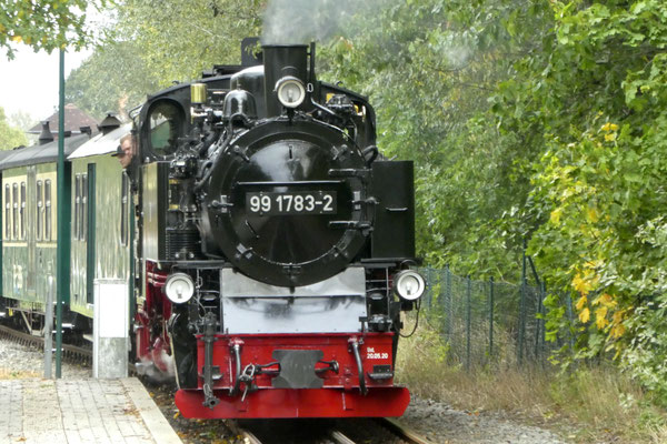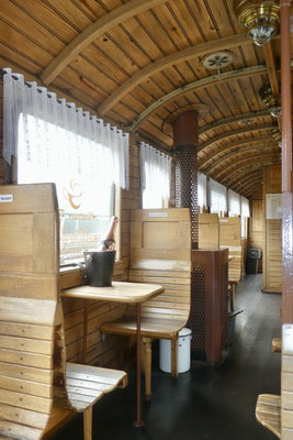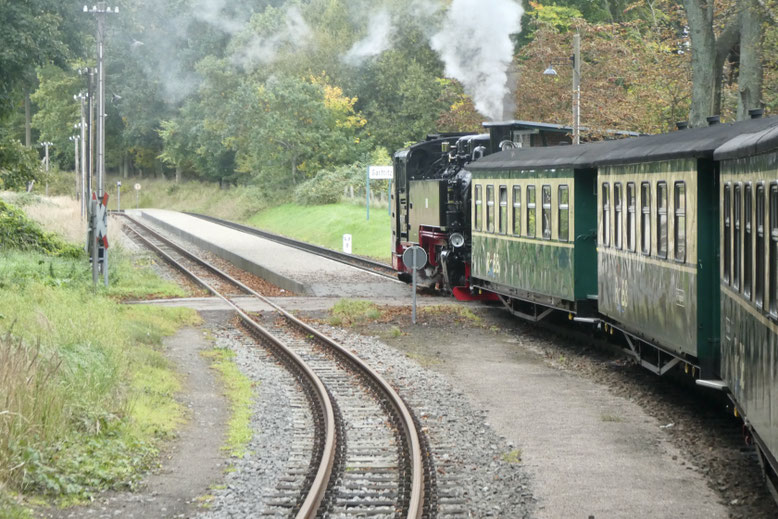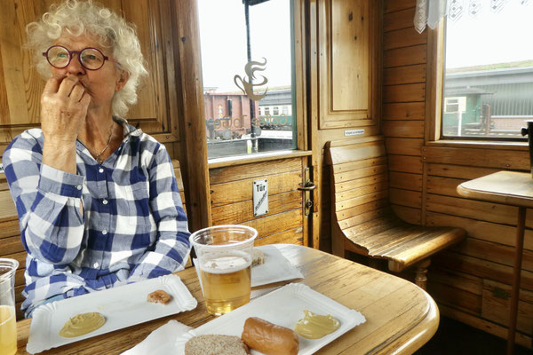 Die Wäsche trocknet in der Nacht von Freitag auf Samstag in der Halle nicht so schnell, wie wir es uns erhofft hatten. Ein grosser Teil wird deshalb mit dem Wäscheständer ins Apartment verlegt. Mit dem „rasenden Rolland“ fahren wir ab der Mole im Hafen nach Göhren im Mönchsgut. Im gemütlichen Speisewagen geniessen wir auf dem Weg eine Bockwurst mit Bier.