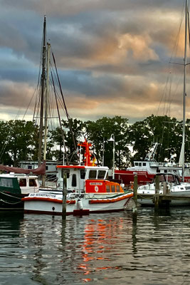 Bei einem herrlich farbenfrohen Sonnenuntergang kehren wir zurück nach Lauterbach, wo wir erst nach Einbruch der Dunkelheit eintreffen. Das Wasser im Hafen ist um 70 cm gestiegen – Leinen und Fender müssen an die neue Höhe angepasst werden. Danach liegt die Odin wieder sicher vertäut im Hafen.