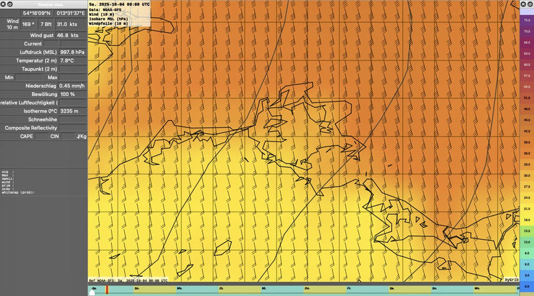 Eine unruhige Nacht liegt hinter uns. Der kräftige Südwind mit Stärke 7 peitscht die Wellen direkt in den Hafen. Die Boote tanzen im heulenden Wind. Ein kräftiges Tiefdruckgebiet bringt stürmisches Wetter über ganz Deutschland, besonders betroffen ist der Norden – ein turbulenter Start ins Wochenende.